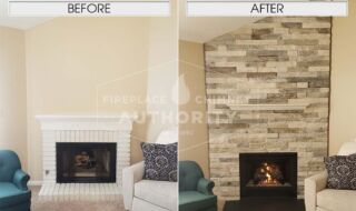 Before & After Fireplace Refacing with Antique White Mantel. Stone Work is completed with Barley Cliffstone 10SF.
